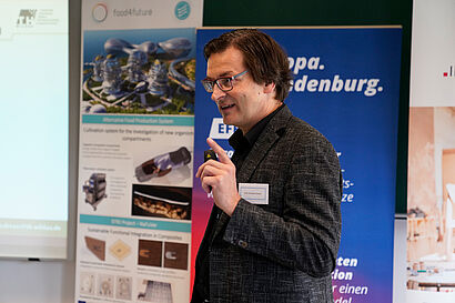 Prof. Klaus-Martin Melzer: „Aktuell arbeiten unsere Forschungsteams an über 140 Projekten mit einem Gesamtvolumen von rund 60 Millionen Euro.“ Besonders erfolgreich ist die TH Wildau derzeit in den Programmen aus dem Europäischen Fonds für regionale Entwicklung (EFRE) und dem Europäischen Sozialfond (ESF), ein Finanzierungsinstrument der Europäischen Union. Prof. Melzer weiter: „Ohne diese Unterstützung aus der EU wären viele Projekte nicht möglich gewesen. Wir sind dankbar für diese Möglichkeiten. Und wir werden diese auch in der Zukunft benötigen, um weiterhin erfolgreich angewandte Forschung zu betreiben.“ Dass die Hochschule mit der Stadt Wildau eng verbunden ist, kann man bereits am Ortseingang sehen. Daher durfte natürlich auch eine kurze Vorstellung der „Hochschulstadt“ durch den Stadtkämmerer Marc Anders nicht fehlen. Wie die TH Wildau Räume für Innovation nutzt und angewandte Forschung lebt, zeigte sich dann in der Präsentation ausgewählter Projekte. Christian Dreyer, Professor für Faserverbund-Materialtechnologie, präsentierte innovative und nachhaltige Möglichkeiten für Verbundwerkstoffe aus dem EFRE-StaF-Kooperationsprojekt „NaFuVer“. Aus dem 3D-Drucker gab es dazu Namensschilder aus den Materialien für den Kommissar und den Minister. Produkte dieser Art können z.B. für die Überwachung von Urban Farming, wie im Projekt „food4future“, das sich mit der Nahrung der Zukunft beschäftigt, genutzt werden. Passend dazu gab es verschiedene Varianten von Algen und Heuschrecken zum Probieren.