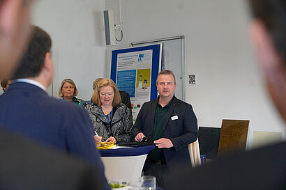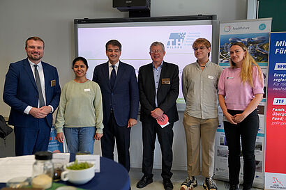 Susanne Dettmann, Koordinatorin des ESF Plus-Projekt „Infopoint ServiceCenter“, erläuterte, wie spezielle Beratungslösungen und ein verbesserter Zugang zu Informationen, insbesondere für Studierende mit nicht-traditionellen Bildungsbiografien oder Beeinträchtigungen, zum Studienerfolg beitragen. Zum Abschluss tauschten sich dann Studierende mit dem EU-Kommissar und Minister Keller über ihren Studienalltag, Entwicklungsperspektiven und Erwartungen aus.