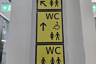 Dabei war die Einheitlichkeit und Wiedererkennbarkeit der neuen Beschilderung nur einer von vielen Aspekten, die es für die Planung und Umsetzung zu berücksichtigen galt. Wichtig war allen Beteiligten darüber hinaus auch die Barrierefreiheit der Beschilderung selbst. Sind die Symbole und Schriftzüge gut erkennbar und leserlich? Welche Vorgaben oder Bedarfe gibt es hinsichtlich Farben, Schrifttypen, Kontrasten, und auf welcher Höhe sollten die Schriftzüge angebracht sein, damit sie auch eine Person bequem lesen kann, die einen Rollstuhl nutzt?