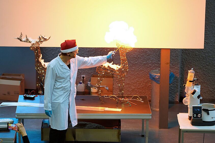 Bei der Kinderuni-Reihe im November und Dezember ging es an drei Samstagen um die Kraft der Mikrochips mit dem Wildauer Team der Mikrosystemtechnik, spannende Einblicke in die Radiowelt mit Susanne Trotzki, Moderatorin bei radioSKW, und eine Nikolaus-Science-Show. Der letzte Termin fand am 6. Dezember, passend zum Nikolaustag, sogar gleich zwei Mal statt. Christian Dreyer, Professor für Faserverbund-Materialtechnologien an der TH Wildau, ließ mit seinem Team Schnee verglühen, Flüssigkeiten erleuchten und Watte explodieren.