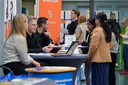 Es folgten angeregte Gespräche an den Ständen zu Praktika, Werkstudierendenstellen, kooperativen Abschlussarbeiten und Stellenangeboten nach dem Abschluss. Wer sich bei der direkten Kontaktaufnahme unsicher fühlte, konnte das Angebot „How to Messe“ und damit eine von Dr. Markus Karbaum, Coach für Job und Karriere, angeleitete Tour über die THCONNECT wahrnehmen, sowohl auf Deutsch als auch auf Englisch. Internationale Besucher*innen hatten außerdem die Möglichkeit, sich in einem Workshop über erfolgreiche Bewerbungsstrategien für den deutschen Arbeitsmarkt zu informieren. Auch die TH Wildau präsentierte sich in diesem Jahr erstmalig als Arbeitgeberin mit einem eigenen Stand – „Come as you are“ lautete hier das Motto. Beim Format „THTalk Alumni x Studi“ berichteten zwei ehemalige Studierende der TH Wildau von ihren individuellen Karrierewegen nach dem Abschluss. Die Besucher*innen konnten Fragen stellen und sich wertvolle Tipps und Hinweise für den Eintritt ins Berufsleben holen.