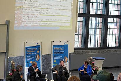 Ein Kernbestandteil des FoNeMo war auch in der 9. Ausgabe die lebhafte Podiumsdiskussion. Unter der Moderation von Prof. Christian Rudolph diskutierten Staatssekretärin Dr. Ina Bartmann (MIL Brandenburg), Dr. Lutz Kaden (IHK Berlin, Clustermanagement Mobilität und Verkehr) und Prof. Klaus-Martin Melzer (Vizepräsident für Forschung und Transfer der TH Wildau) über die Anforderungen an die nächste Generation von Mobilitätsexpert*innen.