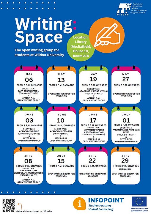 Die offene Schreibgruppe für Studierende an der TH Wildau findet ab dem 06.05. meist mittwochs ab 15:00 Uhr statt. Sie bietet den Studierenden die Gelegenheit sich ganz auf ihre eigenen Texte zu konzentrieren. An bestimmten Terminen gibt es am Anfang kurze Impulse, welche abgesehen von Academic Writing, auf Deutsch sein werden.